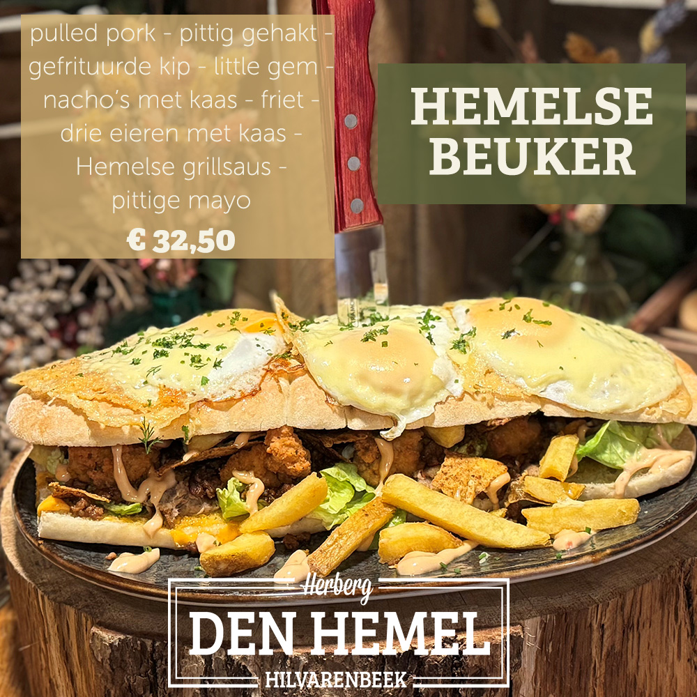 De Hemelse Beuker – van maar liefst 1150 gram – test je grenzen én je broekband! Wie hem solo verslaat, verdient eeuwige roem en wordt onsterfelijk op onze Hemelse Wall-Of-Fame als ‘De Grootbeuker’.