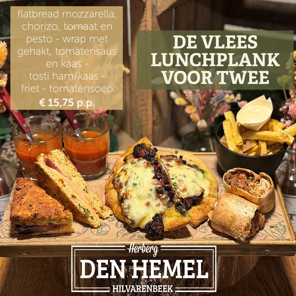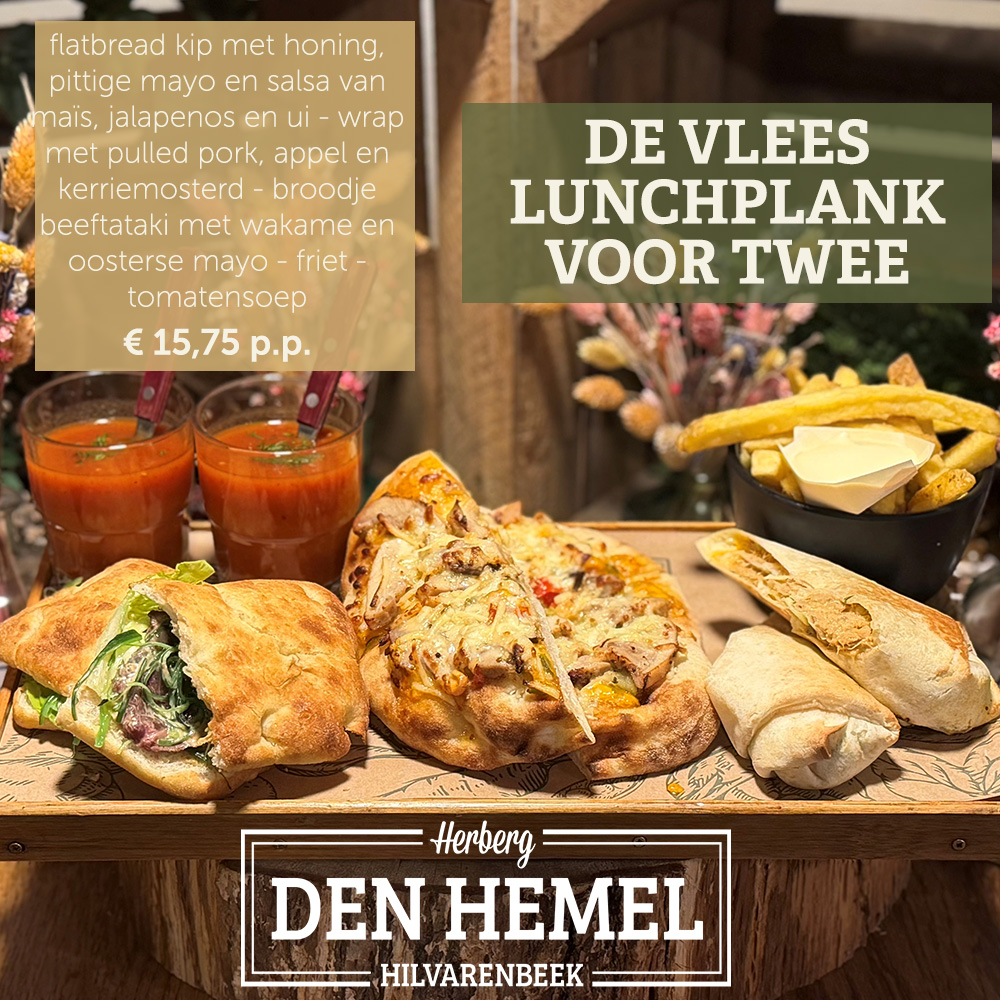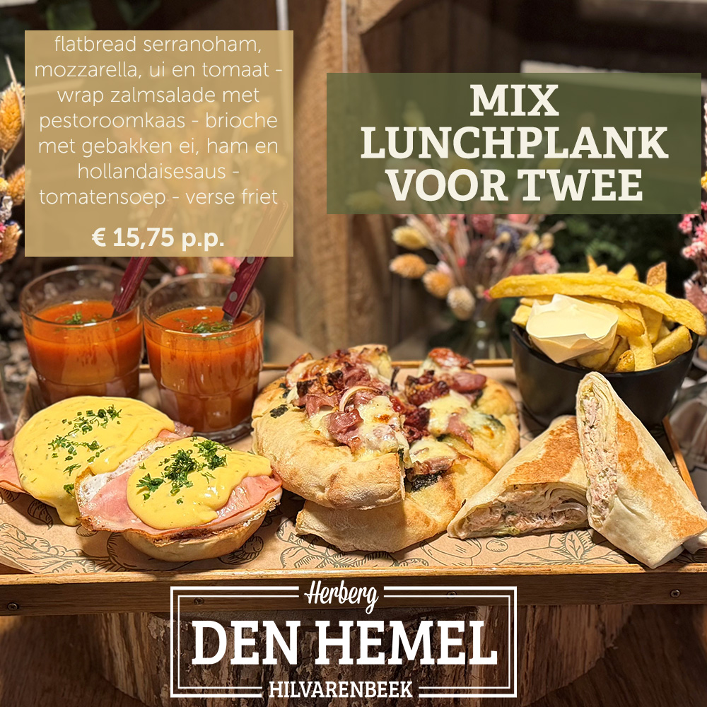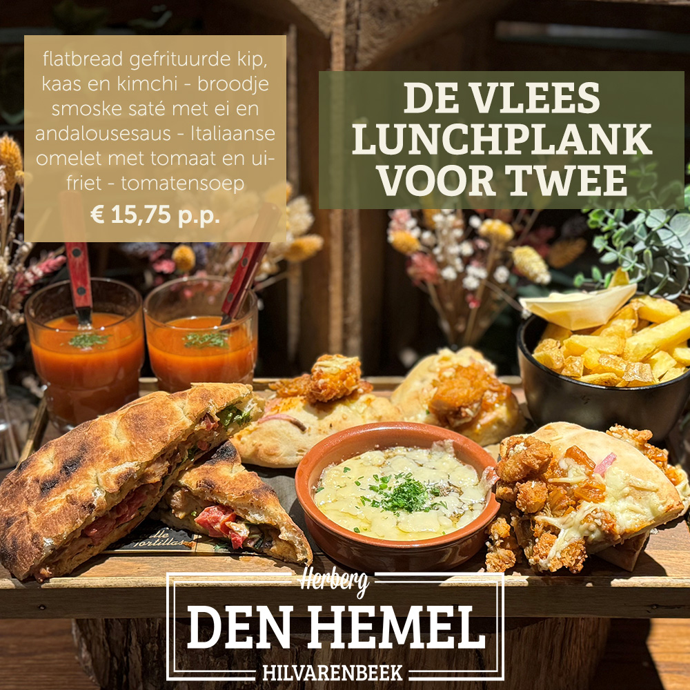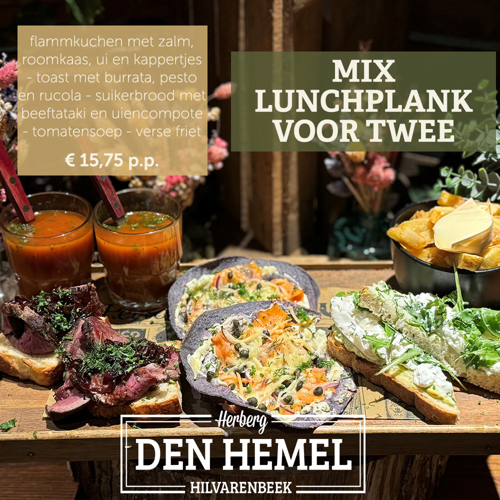 Om 11:00 uur start onze lunch. Heb je echte stevige trek? Probeer dan ons Hemels-uurtje! We hebben een vis-, vega- en vlees variant waar je de rest van de dag mee vooruit kunt!