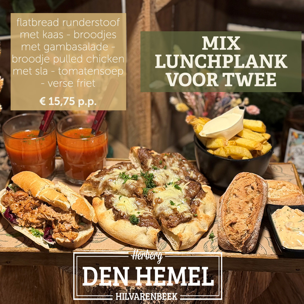 Om 11:00 uur start onze lunch. Heb je echte stevige trek? Probeer dan ons Hemels-uurtje! We hebben een vis-, vega- en vlees variant waar je de rest van de dag mee vooruit kunt!